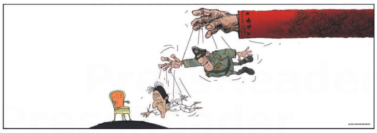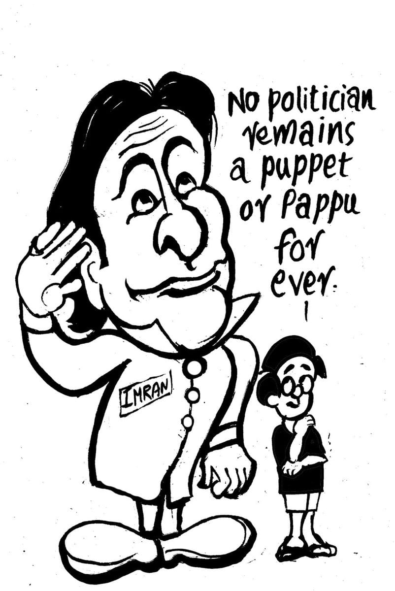 टाइम्स ऑफ इंडिया कार्टून में एक पाकिस्तानी सेना के जनरल द्वारा इमरान खान को आदेश देते दिखाया गया हैं। आम तौर पर ऐसा दिखाई दे रहा है की जनरल खान को पैड बांधने और बल्लेबाजी करने के लिए कह रहा है बावजूद उनके पास चुने हुए प्रधानमंत्री के लिए तैयार डायपर पैड का एक पैक है।