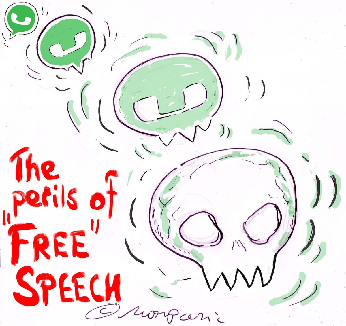 कार्टूनिस्ट हेमंत मोरपारिया व्हाट्सएप पर फ्री स्पीच के साथ आने वाले खतरों को दर्शाते है। उनका कार्टून हमला करता है कि कैसे व्हाट्सएप संदेशों के अफवाह के कारण हाल में लिंचिंग की घटनाओं बढ़ी है ।