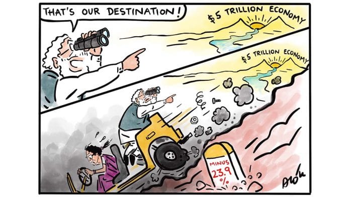 आलोक निरंतर आज के विशेष रूप से प्रदर्शित कार्टून में, अप्रैल-जून तिमाही में अर्थव्यवस्था के अपनी सबसे तेज गिरावट, 2020-21 की पहली तिमाही में इसके 23.9 प्रतिशत के रिकॉर्ड स्तर पर सिकुड़ने को लेकर, मोदी सरकार पर कटाक्ष करते हैं.