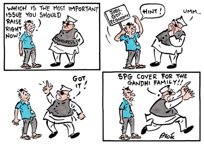 आलोक निरंकार दर्शाते हैं कि देश बेरोजगारी, कम जीडीपी और खराब अर्थव्यवस्था के दौर से गुजर रहा हैं और इसी समय कांग्रेस पार्टी गांधी परिवार की एसपीजी कवर को हटाने को लेकर आक्रोश कर रहा है.