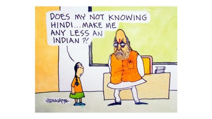 नाला पोनप्पा शनिवार को गृह मंत्री अमित शाह द्वारा हिंदी पर की गई टिप्पणी को अपने कार्टून में दर्शा रहे हैं. अमित शाह ने कहा था कि हिंदी भारत की राष्ट्रीय भाषा होनी चाहिए.