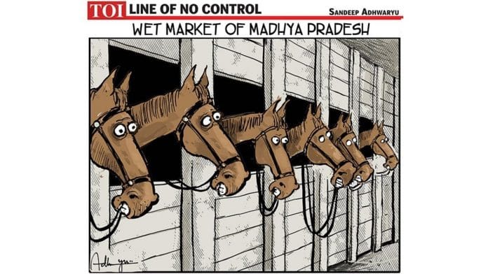 आज के विशेष रूप से प्रदर्शित कार्टून में, संदीप अध्वर्यु ने मध्यप्रदेश में हॉर्स ट्रेडिंग कर कोविड-19 के मुसीबत के दौरान कमलनाथ सरकार को और कैबिनेट गिराने का काम किया गया. जिसकी वजह से राज्य में कोविड-19 के मामले को लेकर कुप्रबंधन देखने को मिला जिसकी वजह से आज वहां सबसे अधिक कोरोनासंक्रमण के मामले देखने को मिल रहे हैं.