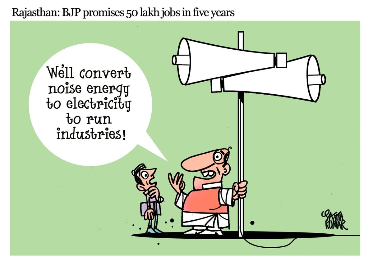 डेक्कन हेराल्ड में साजिथ कुमार राजस्थान में पांच साल में 50 लाख नौकरियां प्रदान करने के बीजेपी के चुनावी वादे का मज़ाक उड़ाते हैं.