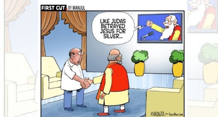 आज के विशेष रुप से प्रदर्शित कार्टून में मंजुल ने प्रधानमंत्री नरेंद्र मोदी पर तंज कसते हुए केरल की एलडीएफ सरकार की तुलना जूडस इस्कैरियट से की है, जिसने ईसा मसीह को धोखा दिया था, गृहमंत्री अमित शाह की एनसीपी नेता शरद पवार के साथ बैठक की अफवाह पर टिप्पणी कर रहे हैं मंजुल.