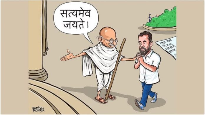 आज के विशेष रूप से प्रदर्शित कार्टून में, सतीश आचार्य ने राहुल गांधी को उनकी संसदीय सदस्यता फिर प्राप्त होने पर उन्हें महात्मा गांधी के साथ प्रतिष्ठित वाक्यांश “सत्यमेव जयते” साथ दर्शाया गया है.