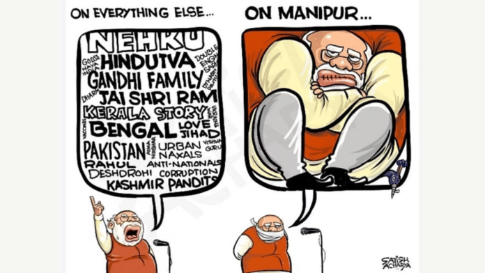 आज के फीचर कार्टून में सतीश आचार्य मणिपुर में जारी हिंसा पर प्रधानमंत्री नरेंद्र मोदी की चुप्पी पर कटाक्ष कर रहे है.