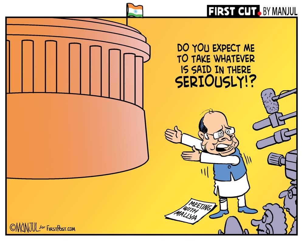 विजय माल्या के कहने के बाद की उन्होंने भारत छोड़ने से पहले अरुण जेटली से मुलाकात की, इसके बाद से भाजपा मंत्री की विश्वसनीयता पर सवाल उठाए जा रहे हैं. कार्टूनिस्ट मंजुल संसद में नेताओं के बीच बातचीत को दर्शाने के लिए व्यंग्य का उपयोग करते हैं.