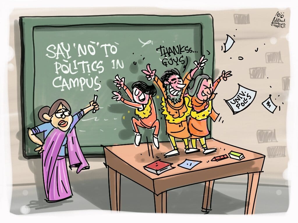 मीक़ा अज़ीज़ अपने कार्टून में, कैंपस राजनीति पर विशेष रूप से दिल्ली विश्वविद्यालय के छात्र संघ चुनावों में एबीवीपी की जीत पर तंज करते हैं. इस कार्टून के माध्यम से यह दर्शाते हैं की किस प्रकार से शिक्षिका अपने छात्रों को कॉलेज की राजनीति में शामिल न होने और पुनः शिक्षा की तरफ वापस लाने की कोशिश कर रही हैं.