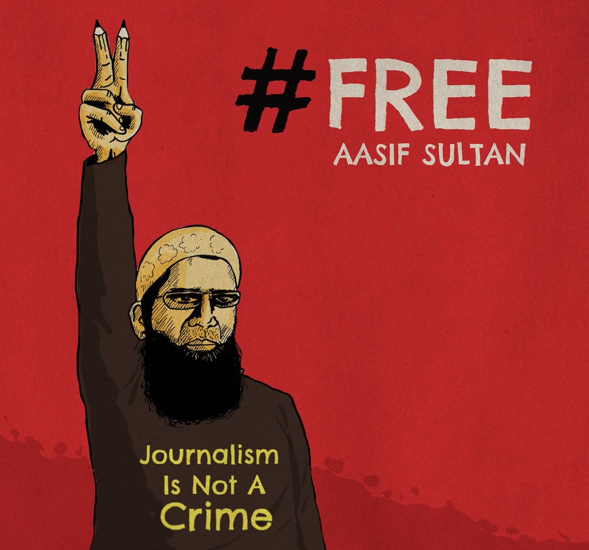मीर सुहैल का कार्टून गिरफ्तार कश्मीरी पत्रकार आसिफ सुल्तान के साथ एकजुटता के लिए हैं, जो कथित तौर पर एक आतंकवादी हमले में शामिल था। जो श्रीनगर में स्थानीय समाचार पत्रिका में काम करता था. सुल्तान को 22 सितंबर तक न्यायिक हिरासत में रखा गया है.