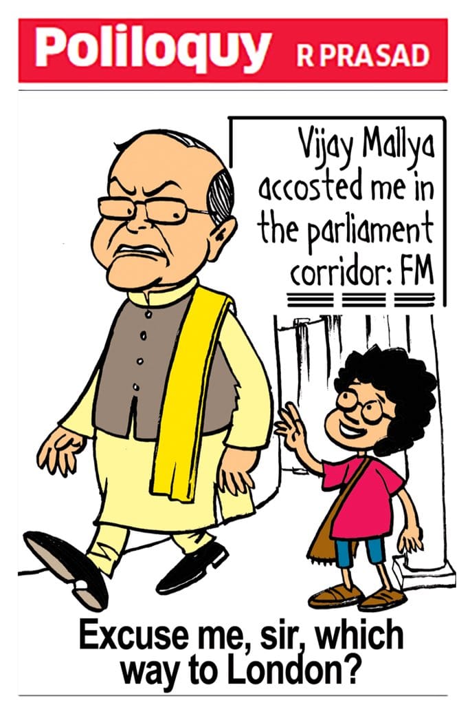 आर.प्रसाद अपने प्रतिष्ठित कार्टून चरित्र को संसद के गलियारे में अरुण जेटली से मिलते हुए दर्शाते हैं. उनका कटाक्ष यह दर्शाता हैं कि अरुण जेटली ने विजय माल्या को लंदन जाने का सुझाव दिया था.