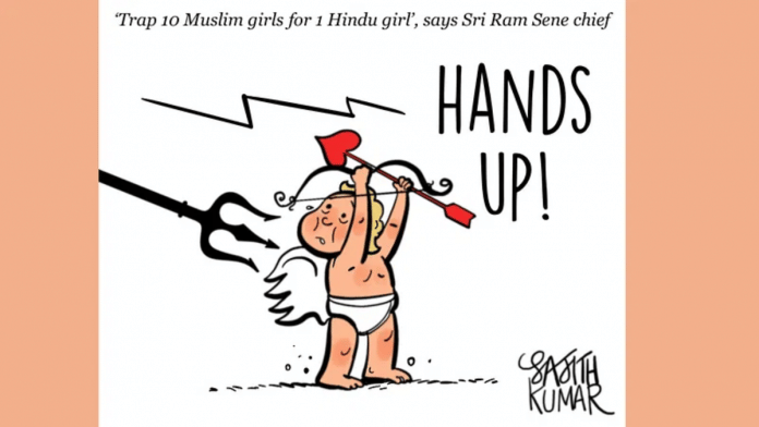 आज के प्रदर्शित कार्टून में, साजिथ कुमार ने ‘लव जिहाद’ खतरों को दर्शाया है, जो पिछले सप्ताह कर्नाटक स्थित श्री राम सेना के प्रमुख प्रमोद मुथालिक द्वारा की गई विवादास्पद टिप्पणी की पृष्ठभूमि में है. रविवार को बागलकोट में एक जनसभा को संबोधित करते हुए उन्होंने समर्थकों से कहा, ‘मैं अपने लोगों को निर्देश दे रहा हूं, अगर हम एक हिंदू लड़की (लव जिहाद के लिए) को गंवाते हैं, तो आप 10 मुस्लिम महिलाओं को फंसाएं’