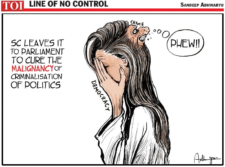 इकोनॉमिक टाइम्स में आर. प्रसाद सुप्रीम कोर्ट के निर्देश पर व्यंगात्मक टिप्पणी करते है. वो दर्शाते है कि आपराधिक छवि वाले व्यक्ति को चुनाव में उम्मीदवार बना दिया गया है.