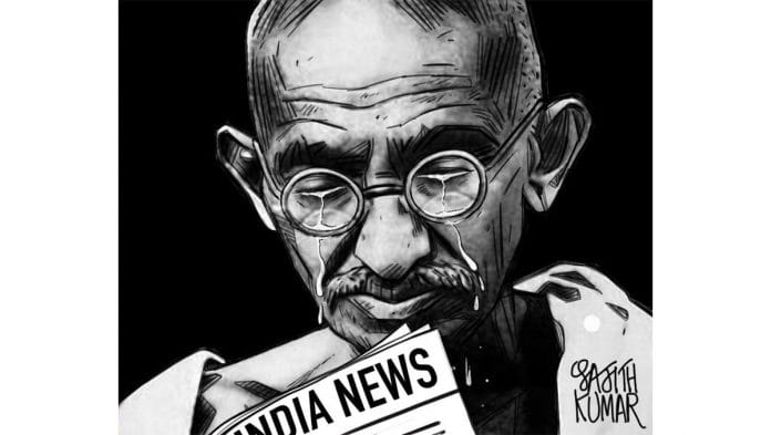 आज के अपने खास प्रदर्शित कार्टून में साजिथ कुमार चित्रित करते हैं कि महात्मा गांधी का हाल की भारत में खबरों पर कैसे प्रतिक्रिया होती, खासकर उत्तर प्रदेश में कई बलात्कारों के मामलों के मद्देनजर.