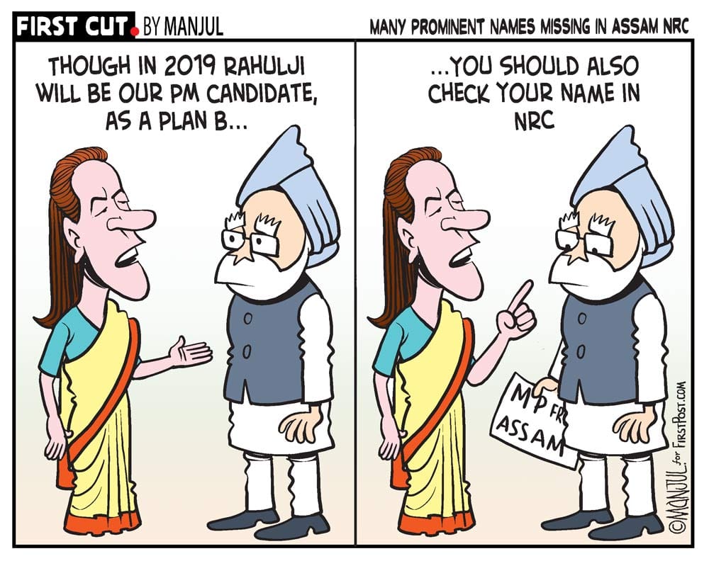 कार्टूनिस्ट मंजुल अपने कार्टून के संस्करण में एनआरसी सूची के मसौदे पर तंज करते है जिसमें 40 लाख लोगों में कुछ प्रमुख लोगों को भी बाहर कर दिया गया है । सूची में कांग्रेस और बीजेपी विधायकों सहित कई प्रमुख व्यक्तित्व हैं। पूर्व राष्ट्रपति फ़ख़रुद्दीन अली के रिश्तेदार भी सूची में शामिल नहीं हैं। कार्टून में मंजुल सुझाव देते है की पूर्व प्रधानमंत्री मनमोहन सिंह को सूची में अपना नाम देख लेना चाहिए ,जो असम से एक सांसद है।
