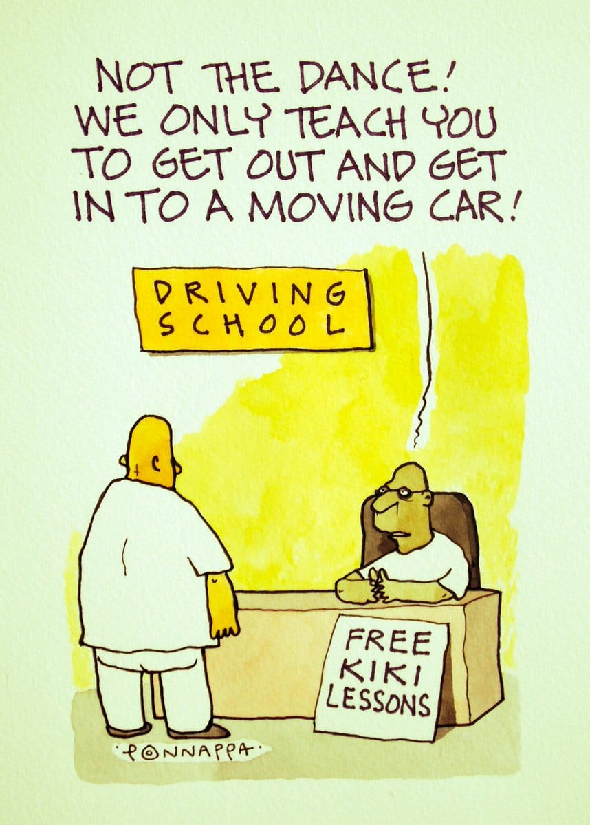 कार्टूनिस्ट नाला पोन्नप्पा अपने कार्टून में एक किकी चुनौती दिखते है। वह ड्राइविंग के बजाए शिक्षार्थियों को “मुफ्त किकी शिक्षा ” देने के लिए स्कूल चलने का सुझाव देते है ।