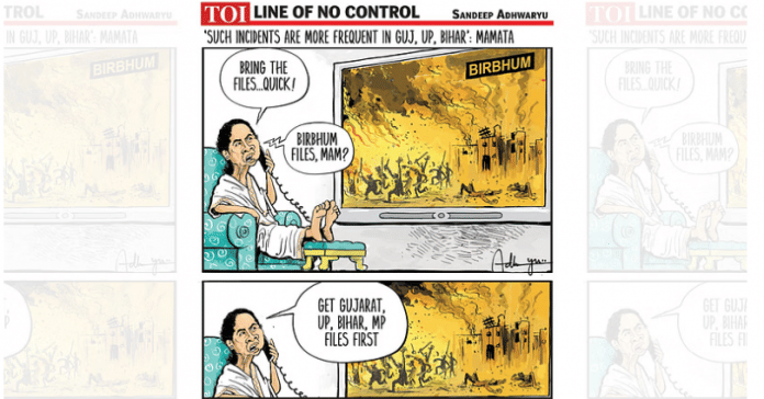 आज के फीचर्ड कार्टून में संदीप अध्वर्यु ने बीरभूम नरसंहार पर पश्चिम बंगाल की मुख्यमंत्री ममता बनर्जी की प्रतिक्रिया पर टिप्पणी करते हुए कश्मीर से पंडितों के पलायन के बारे में फिल्म द कश्मीर फाइल्स का जिक्र किया है. बंगाल के बीरभूम जिले के एक गांव में सोमवार रात तृणमूल कांग्रेस (टीएमसी) के एक स्थानीय नेता की कथित तौर पर हत्या के बाद हुए हमले में घरों में कथित आग लगाने से आठ लोगों की मौत हो गई थी. हमले को ‘दुर्भाग्यपूर्ण’ बताते हुए ममता ने कहा था कि इस तरह की घटनाएं कई अन्य राज्यों – उत्तर प्रदेश, गुजरात, बिहार, मध्य प्रदेश और राजस्थान में ज्यादा आम थीं.