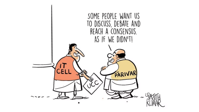 आज के विशेष कार्टून में, साजिथ कुमार केंद्र सरकार की जवाबदेही की कमी पर जोर देते हैं, जिसके परिणामस्वरूप यूसीसी जैसे मामले पर देश की राय को बाहर रखा जाता है.