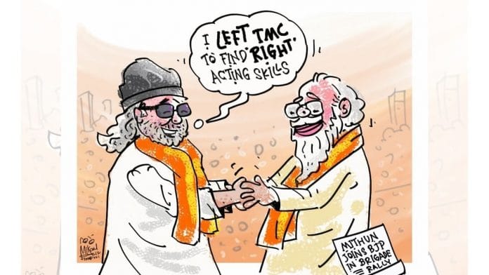 बंगाल चुनाव से पहले अभिनेता मिथुन चक्रवर्ती के भाजपा में शामिल होने को आज के फीचर कार्टून में चित्रित कर रहे हैं मीका अजीज.