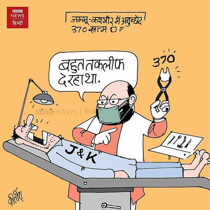बीबीसी के कीर्तिश भट्ट ने अनुच्छेद 370 पर केंद्र के कदम को दर्शाया है, जिसमें कई आरोप लगाए कि सरकार ने कश्मीर में हितधारकों को आगे बढ़ने से पहले सलाह नहीं ली है. कीर्तीश ने कार्टून में अमित शाह को डॉक्टर, जम्मू-कश्मीर को मरीज और 370 को दांत के रूप में दिखाया है जिसे शाह ने उखाड़ दिया है. chandan-7august