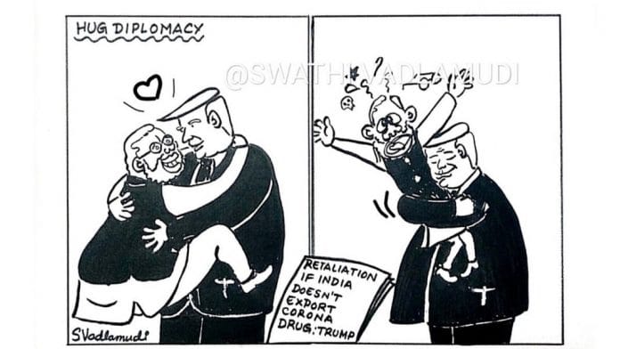 आज के फीचर कार्टून में स्वाथी वडलामुडी प्रधानमंत्री मोदी और ट्रंप की दोस्ती पर निशाना साध रही हैं. एक प्रेस कांफ्रेंस में ट्रंप ने भारत को धमकी भरे लहजे में प्रतिक्रिया दी है.