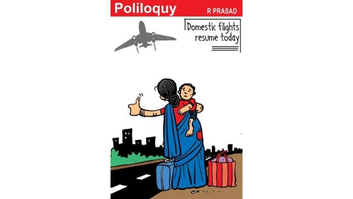 आज के फीचर कार्टून में आर प्रसाद सरकार को यह याद दिलाने की कोशिश कर रहे हैं कि जब अब सरकार ने घरेलू उड़ाने शुरू कर दी हैं, तब भी कई लोग अपने गांव तक पैदल चलने पर मजबूर हैं.