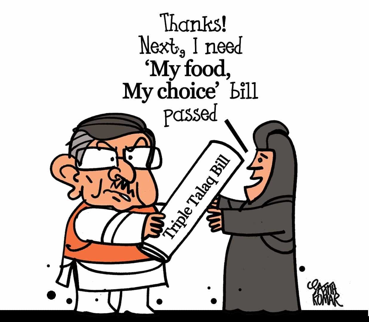 साजिथ कुमार ने डेक्कन हेराल्ड में ट्रिपल तलाक़ को दर्शाया है. राष्ट्रपति ने गुरुवार को कानून को मंजूरी दे दी है. कार्टूनिस्टों को यह भी लगता है कि मुसलमानों को अब सरकार से एक विधेयक कि मांग करनी चाहिए जो यह सुनिश्चित करे कि वे जो चाहें वो खा सकते हैं.