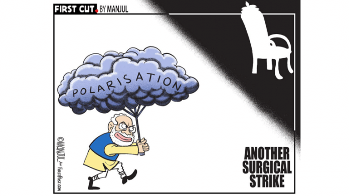आज के कार्टून में मंजुल प्रधानमंत्री नरेंद्र मोदी के ‘रडार’ वाले बयान पर तंज करते हैं. कार्टूनिस्ट ’टाइम ‘ मैगज़ीन के कवर फ़ोटो का जिक्र करते हैं जहां पर प्रधानमंत्री नरेंद्र मोदी को ‘इंडियाज़ डिवाइडर-इन-चीफ’ के रूप में चित्रित किया गया है. क्योंकि नरेंद्र मोदी प्रधानमंत्री कुर्सी पर फिर से पहुंचने के लिए ‘ध्रुवीकरण’ की राजनीति का उपयोग कर रहे हैं.