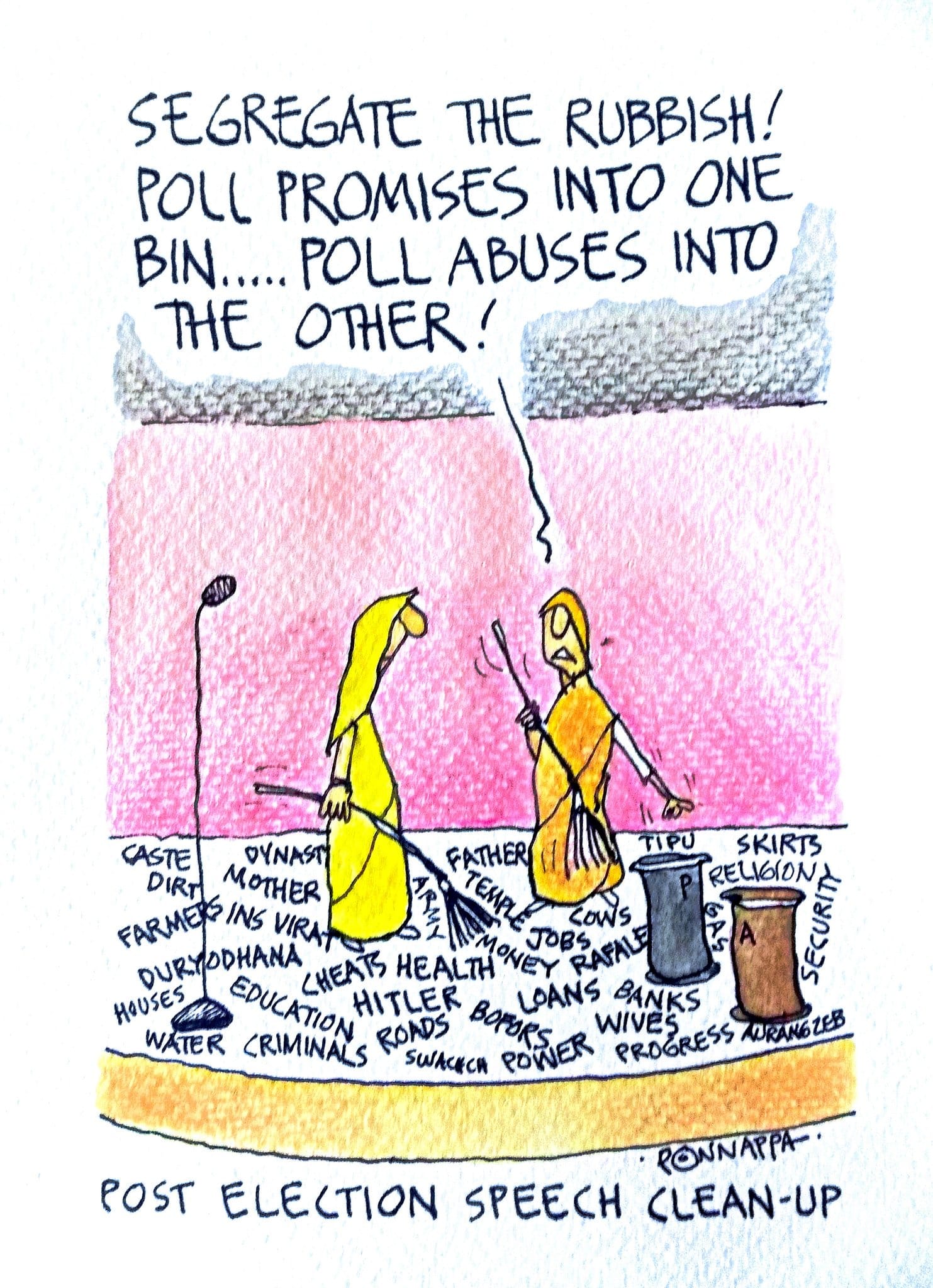 नाला पोनप्पा चुनाव प्रचार के दौरान राजनीतिक नेताओं द्वारा किए गए झूठे वादों और अपमानजनक टिप्पणियों पर व्यंग करते हैं और वे ‘चुनाव के बाद के भाषण की सफाई’ को भी दर्शाते हैं.