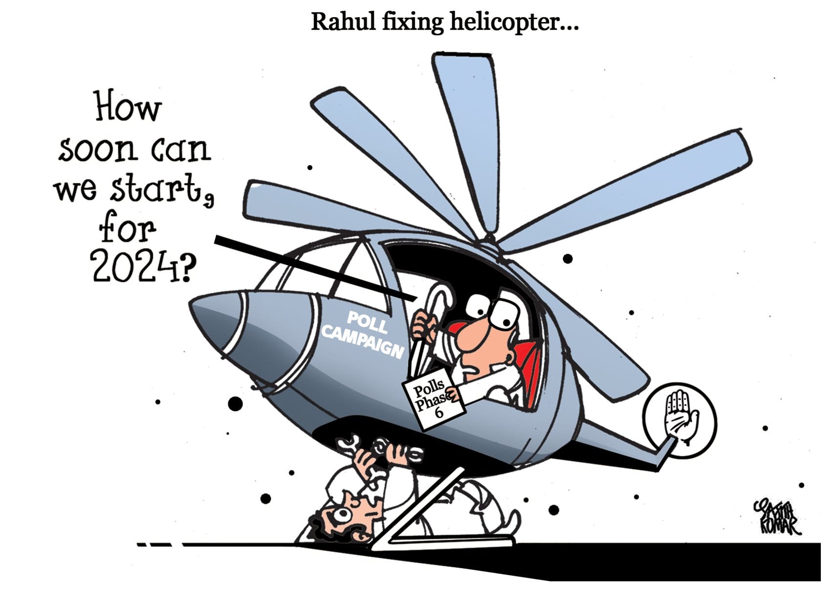 साजिथ कांग्रेस अध्यक्ष राहुल गांधी की एक तस्वीर को पुन: चित्रित करते हैं और साजिथ कुमार इस लोकसभा चुनाव में कांग्रेस के प्रचार अभियान पर कटाक्ष करते हैं. राहुल गांधी हिमाचल प्रदेश में एक रैली के दौरान एक हेलीकॉप्टर को ठीक करने की कोशिश करते हुए दिखाई देते हैं.