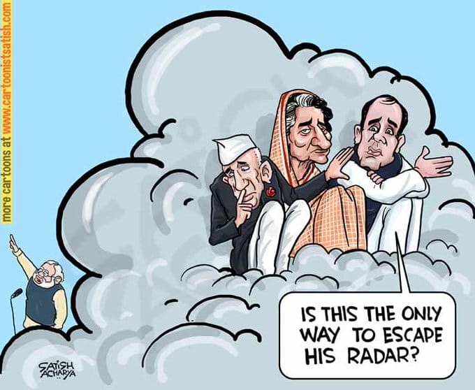 प्रधानमंत्री नरेंद्र मोदी के द्वारा प्रचार अभियान के भाषणों में दिवंगत कांग्रेस नेताओं पर लगातार हमलों और उनकी हालिया ‘रडार’ टिप्पणी पर सतीश आचार्य तंज करते हैं. सतीश आचार्य पूर्व कांग्रेस प्रधानमंत्रियों जवाहरलाल नेहरू, इंदिरा गांधी और राजीव गांधी को पीएम से बचने के लिए एक बादल से छुपते दिखा रहे हैं.