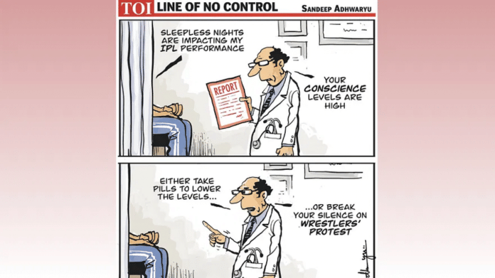 आज के फीचर कार्टून में, संदीप अध्वर्यु रेसलिंग फेडरेशन ऑफ इंडिया (डब्ल्यूएफआई) के प्रमुख और बीजेपी सांसद बृजभूषण शरण सिंह के खिलाफ हाल ही में पहलवानों के विरोध प्रदर्शन पर अपनी राय दे रहे हैं. पहलवान विनेश फोगाट ने क्रिकेट के प्रमुख खिलाड़यिों और खेल के दिग्गजों से समर्थन नहीं मिलने पर अपनी निराशा व्यक्त की है.
