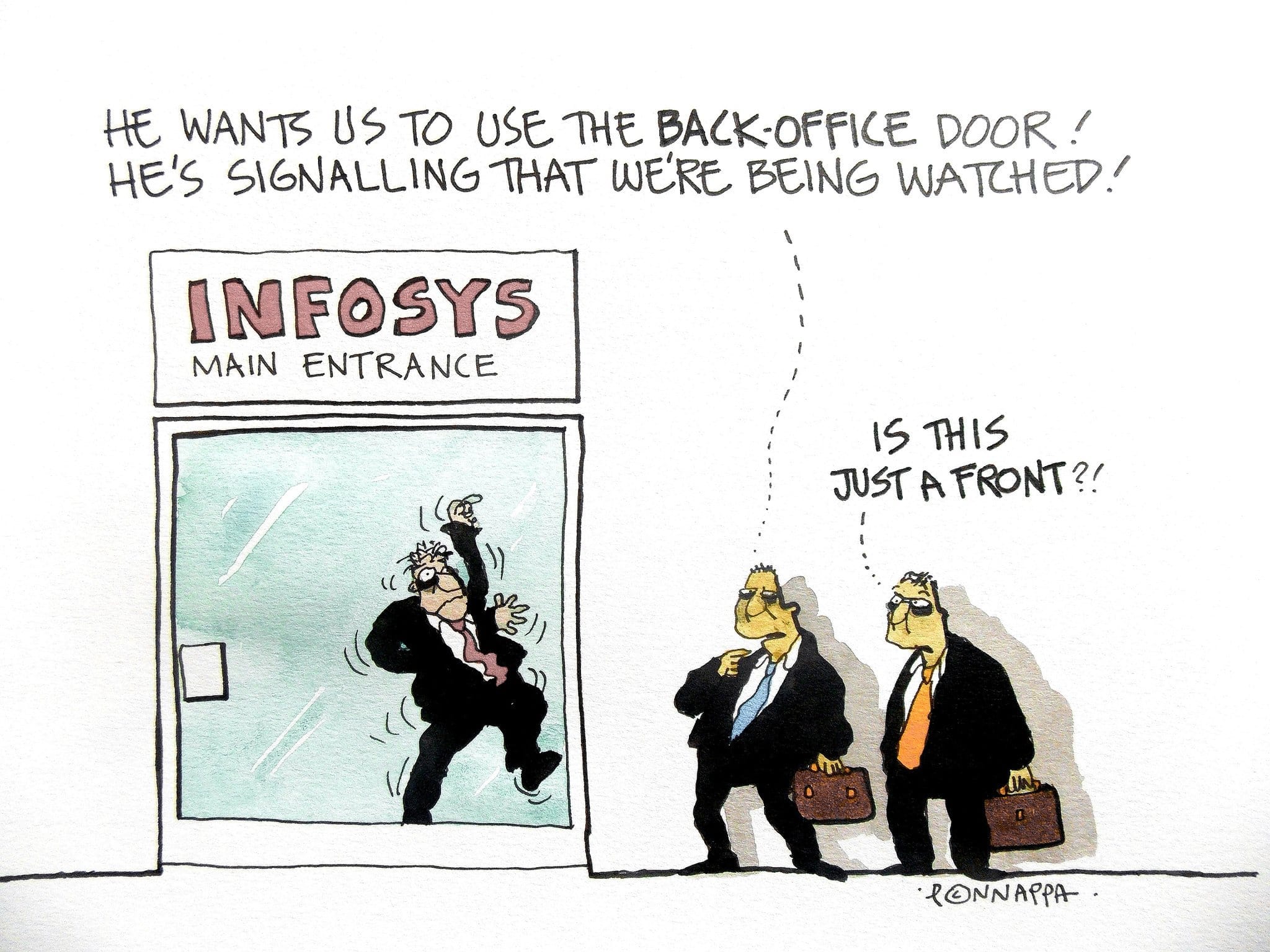 नाला पोनप्पा अपने कार्टून में देश की दिग्गज आईटी कंपनी इन्फोसिस के विवाद को दर्शाते हैं. कंपनी के शेयर में गिरावट का सिलसिला लगातार जारी है.