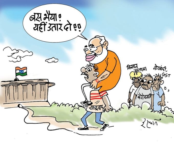इरफान प्रधानमंत्री नरेंद्र मोदी को राष्ट्रवाद के सहारे संसद की सवारी करते हुए दर्शाते हैं और लोकसभा चुनाव में उन्होंने बेरोजगारी और कृषि संकट जैसे मुद्दों की भी अनदेखी की है.