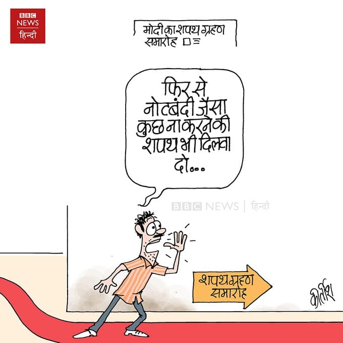 मोदी सरकार ने दूसरी कार्यकाल की शपथ ली है कीर्तीश भट्ट एक आम आदमी को दर्शाते हैं कि वह राष्ट्रपति से आग्रह करता है कि वे नए शासन से सुनिश्चित करवाएं कि विमुद्रीकरण जैसी नीतियों को लागू नहीं किया जाए.
