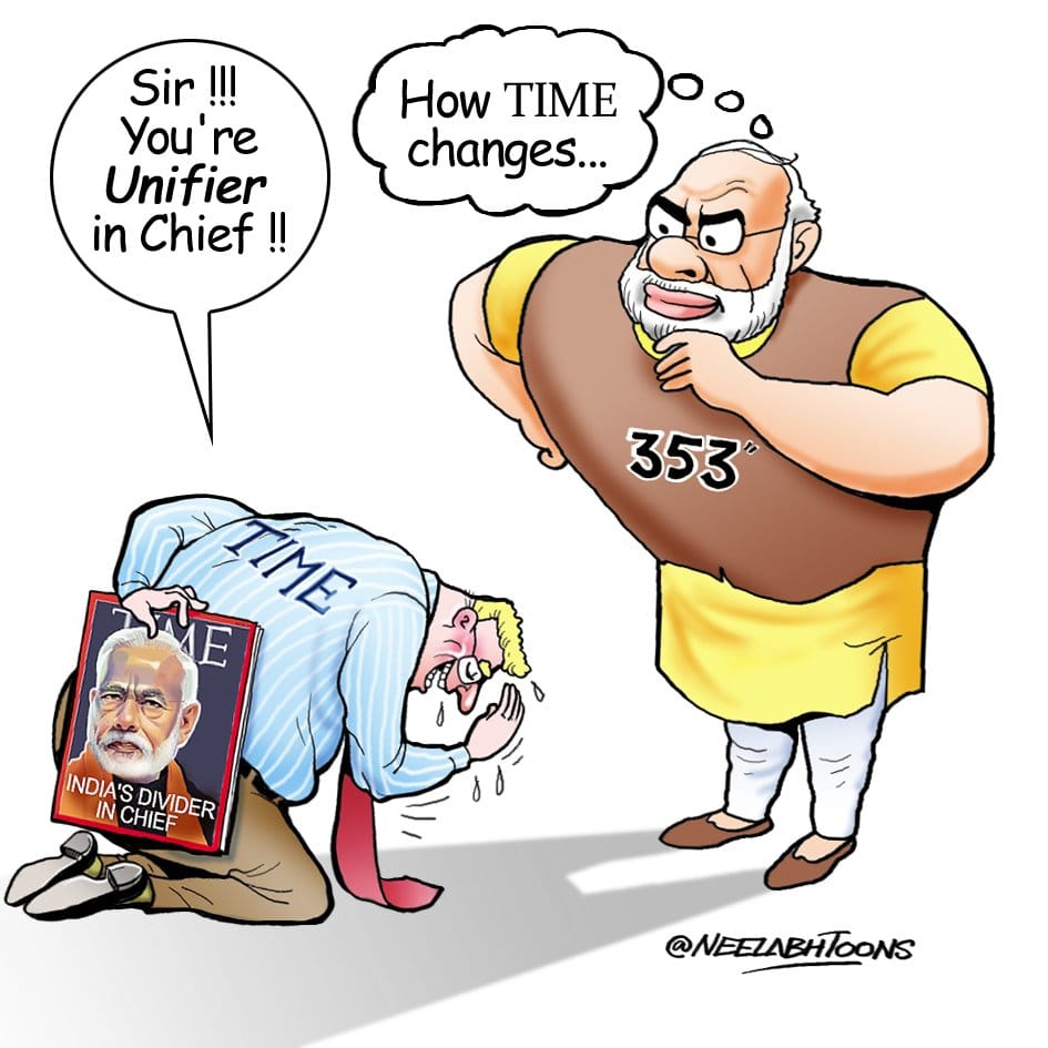 टाइम मैगज़ीन ने भारी बहुमत से मोदी के सरकार में वापसी को देखते हुए पलटी मार ली है जिसे बड़े ही खास अंदाज से प्रेषित किया गया है. पत्रिका ने भारत के प्रधानमंत्री नरेंद्र मोदी एकजुट किया है दशकों से उस तरह से किसी भी प्रधानमंत्री ने नहीं किया है. नीलाभ बनर्जी टाइम मैगज़ीन के रुख में बदलाव पर प्रकाश डालते हैं , जिसने प्रधानमंत्री नरेंद्र मोदी को कुछ हफ्ते पहले डिवाईडर इन चीफ कहा था.