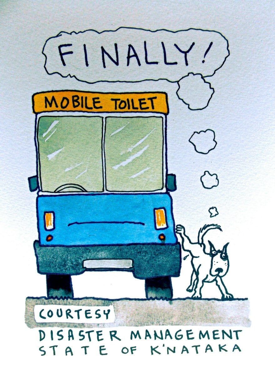 बृहत बेंगलुरु महानगर पालिका ने रविवार को कर्नाटक के कोडागू के बाढ़ प्रभावित इलाकों में मोबाइल शौचालय भेजे है । राहत शिविरों में शौचालय स्थापित किए जाएंगे। नाला पोनप्पा ने अपने कार्टून में मोबाइल शौचालयों की आवश्यकता को दर्शाया है ।