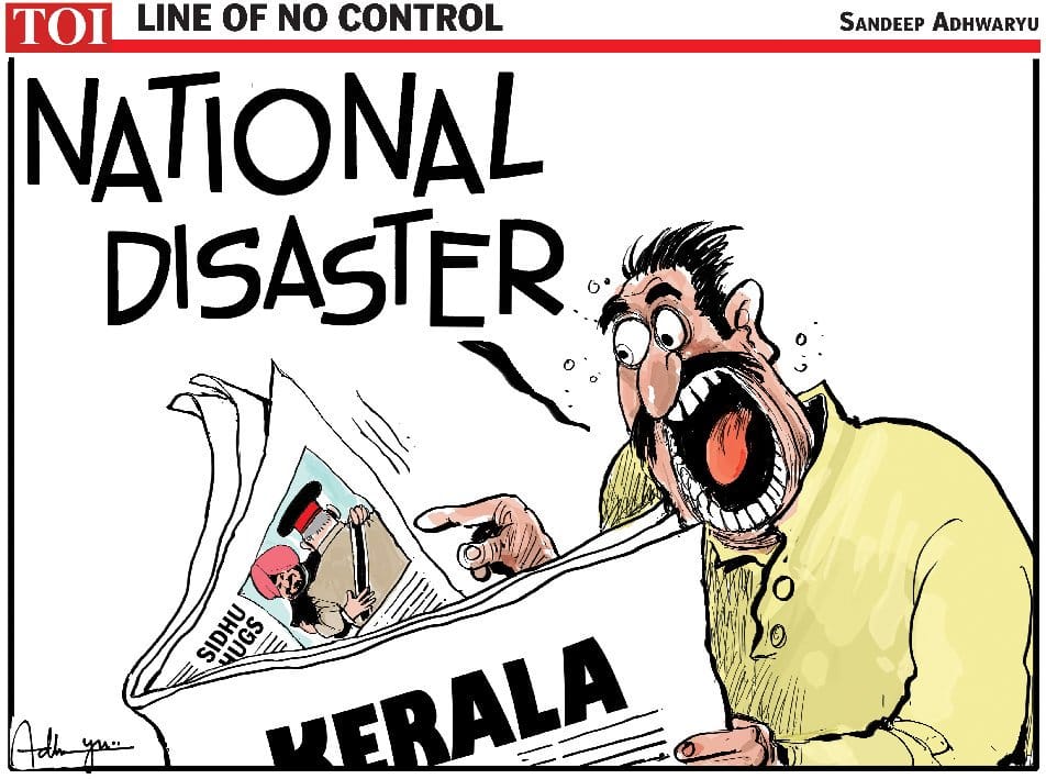 द टाइम्स ऑफ इंडिया में संदीप अध्वर्यु ने दर्शाया है की पाकिस्तान की सेना प्रमुख जनरल कमर जावेद बाजवा के साथ नवजोत सिंह सिद्धू के गले मिलने को लेकर देश के लोग अधिक चिंतित है इस पर उन्होंने तंज किया है जबकि केरल में लाखों लोग विनाशकारी बाढ़ का सामना कर रहे हैं।