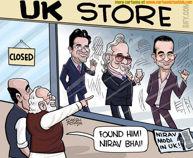 यूनाइटेड किंगडम के प्राधिकारी ने अपने देश में नीरव मोदी की होने की पुष्टि की, जिस पर प्रतिक्रिया करते हुए केंद्रीय जांच ब्यूरो ने प्रत्यर्पण अनुरोध भेजा है। सिफी में, कार्टूनिस्ट सतीश आचार्य ने सुझाव दिया कि विजय माल्या और ललित मोदी समेत सभी भगोड़े अरबपति, ब्रिटेन में मौजूद हैं।