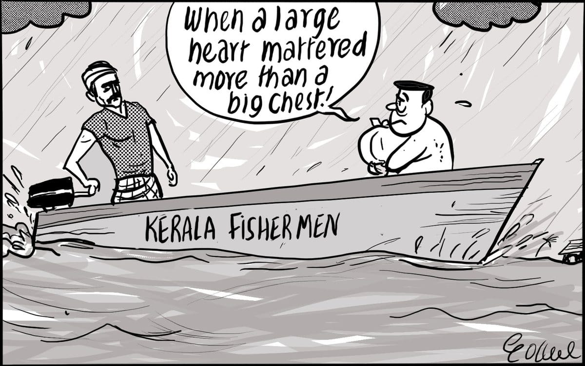 केरल मछुआरों ने बाढ़ पीड़ितों के बचाव में एक महत्वपूर्ण भूमिका निभाई है , यहां तक की केरल सरकार द्वारा दिए गए वित्तीय सहायता को स्वीकार करने से इंकार कर दिया। दूसरी तरफ, बड़े दिल वाले प्रधानमंत्री नरेंद्र मोदी की अध्यक्षता वाली केंद्र सरकार ने पर्याप्त समर्थन नहीं दिया। द एशियन ऐज में, कार्टूनिस्ट गोकुल का कहना है कि मछुआरों ने एक बड़ा दिल दिखाया है ।