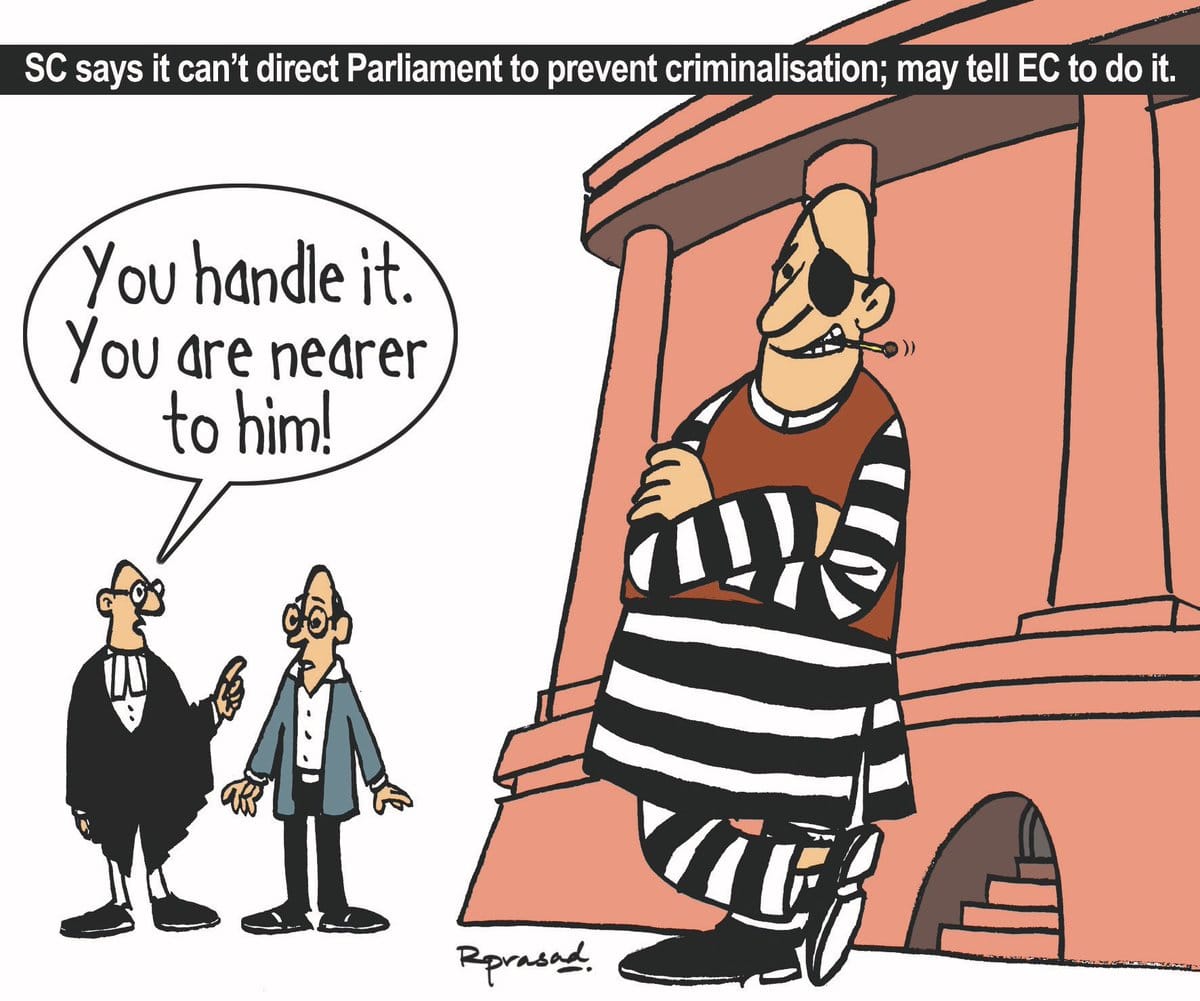 कार्टूनिस्ट आर. प्रसाद ने इकोनॉमिक टाइम्स में सुप्रीम कोर्ट पर तंज किया है। चुनाव आयोग को कहा गया कि वह राजनीतिक दलों से उनके सदस्यों पर आपराधिक आरोप यदि कोई हो तो उसका खुलासा करने के लिए कह सकता है।