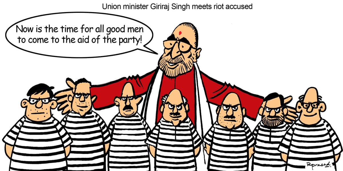 आर प्रसाद केंद्रीय मंत्री गिरिराज सिंह के द्वारा सांप्रदायिक हिंसा को बढ़ावा देने वाले पुरुषों का समर्थन करने के लिए तंज करते हैं। कई ने सुझाव दिया है कि 2019 के लोकसभा चुनावों से पहले ये भाजपा के द्वारा हिंदुत्व हिंसा का खुला समर्थन देने को संकेत हो सकता है।