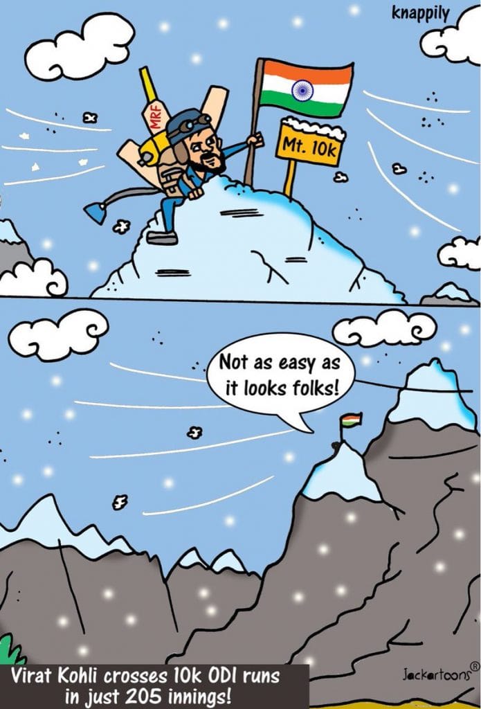 जैक कार्टून विराट कोहली को समर्पित करते हैं, जिन्होंने अपने प्रेरणास्रोत सचिन तेंदुलकर का रिकॉर्ड तोड़ा. तेंदुलकर की तुलना में 54 कम पारी लेते हुए 205 पारियों में वनडे क्रिकेट में 10 हजार रन पूरा किया.