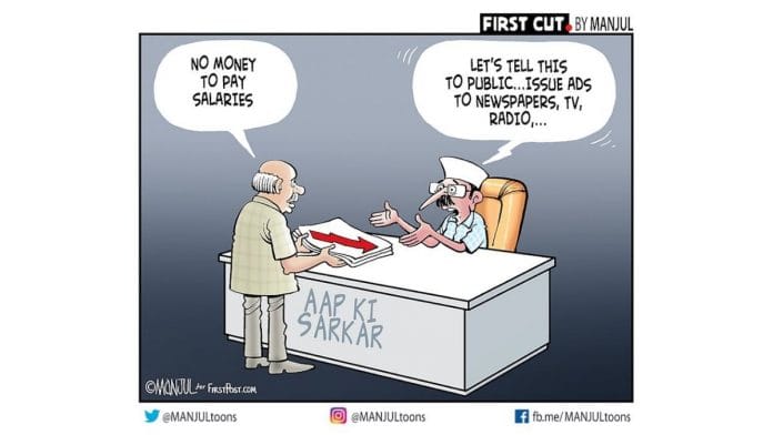 आज के फीचर कार्टून में मंजुल दिल्ली सरकार की विडंबनाओं पर प्रकाश डालते हुए वेतन देने के लिए धन की कमी के बारे में दर्शाते हैं और विज्ञापन देने पर तंज करते हैं.