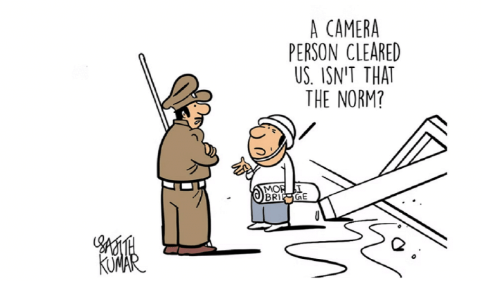 आज के चित्रित कार्टून में, साजिथ कुमार गुजरात के मोरबी में मच्छु नदी पर एक झूला पुल के ढहने की ओर इशारा करते हैं – 7 महीने के मरम्मत कार्य के बाद इसे जनता के लिए फिर से खोलने के चार दिन बाद- जिसमें 135 लोगों की जान चली गई – रिपोर्टों के अनुसार, नगरपालिका द्वारा ‘फिटनेस प्रमाणपत्र’ जारी करने से पहले पुल को फिर से खोल दिया गया था.