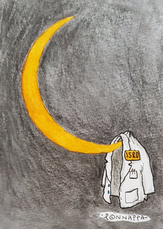 नाला पोन्नपा द फेडरल में इसरो के मिशन चंद्रयान-2 की चंद्रमा पर लैंडिंग के असफल प्रयास का चित्रण करते हैं. अपने चित्र में उन्होंने इसरो को डॉक्टर वाला एप्रन भी पहनाया है.