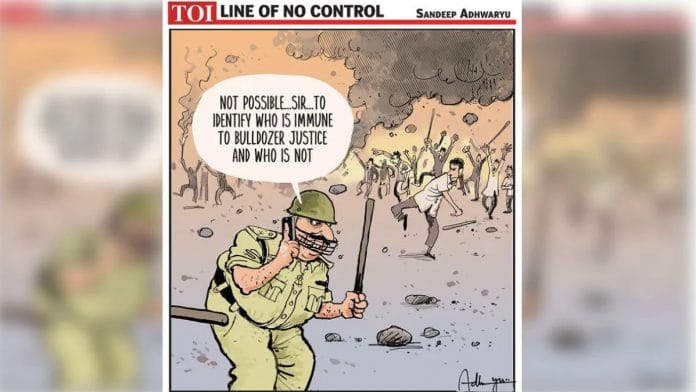 आज के चित्रित कार्टून में, संदीप अध्वर्यु ने कानून प्रवर्तन एजेंसियों द्वारा सैन्य भर्ती के लिए केंद्र की अग्निपथ योजना के खिलाफ हिंसक प्रदर्शनों में शामिल लोगों और पैगंबर मुहम्मद पर निलंबित भाजपा नेता नूपुर शर्मा की टिप्पणी की प्रतिक्रिया के रूप में हिंसा भड़काने के आरोपी लोगों के साथ किए गए विपरीत व्यवहार पर कटाक्ष किया है. बाद के लोगों के घरों के ढहाया गया.