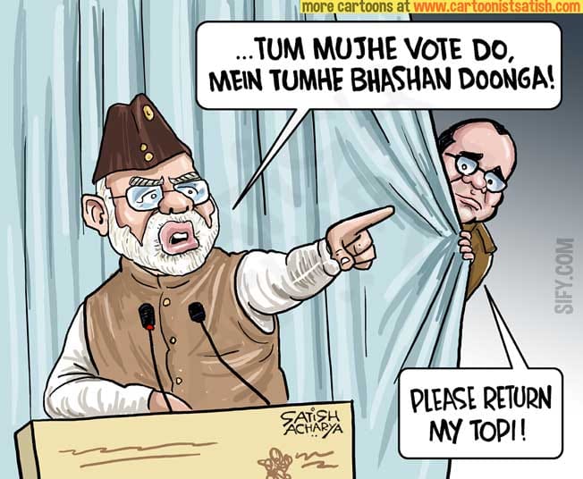 सतीश आचार्य सुभाष चंद्र बोस की आज़ाद हिन्द फ़ौज की 75वी वर्षगांठ पर प्रधानमंत्री के भाषण का मज़ाक उड़ाते हैं और सुभाष चंद्र बोस के नारे “तुम मुझे खून दो मैं तुम्हें आज़ादी दूंगा” और उनकी टोपी का इस्तेमाल खुद के लिए करते हैं.