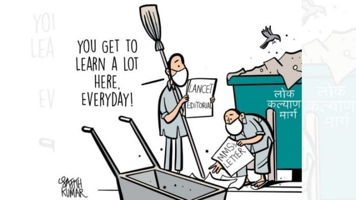 आज के फीचर कार्टून में साजिथ कुमार ने दर्शाया कि किस तरह से नरेंद्र मोदी सरकार ने मेडिकल जर्नल द लांसेट और पूर्व पीएम मनमोहन सिंह से कोविड-19 महामारी से निपटने के लिए मिली आलोचनाओं को कूड़े में मिला दिया है.