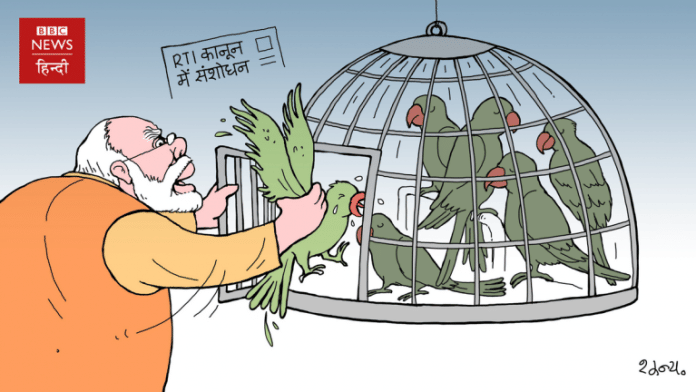 गोपाल शून्य बीबीसी हिंदी में दर्शाते हैं कि सूचना का अधिकार (आरटीआई) अधिनियम, 2005 को नये संशोधन के साथ सोमवार को लोकसभा में पारित किया गया, जिसे वह प्रधानमंत्री द्वारा एक और संस्था को पिंजरे के तोते के रूप में बदलते दिखाया है.