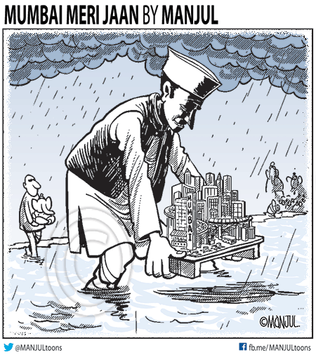 मंजुल गणेश चतुर्थी के त्यौहार का उल्लेख करते हैं और अपने कार्टून में मुंबई में हुए जलजमाव को दर्शाते हैं. मुंबई में मूसलधार बारिश के कारण ऑरेंज अलर्ट है.